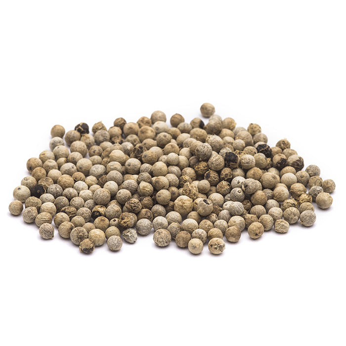 Kremasto bijela, glatka zrna zrelih plodova crnog papra kojima je ogoljena vanjska opna i osušena na suncu. U usporedbi s crnim paprom, ima manje intenzivan miris, blago zemljan i blago slatkast s notama voća. Brušenje se pojačava i dobiva oštrinu koja golica nos. Okus je čist, oštro gorući i osebujan, sa slatkim završetkom.