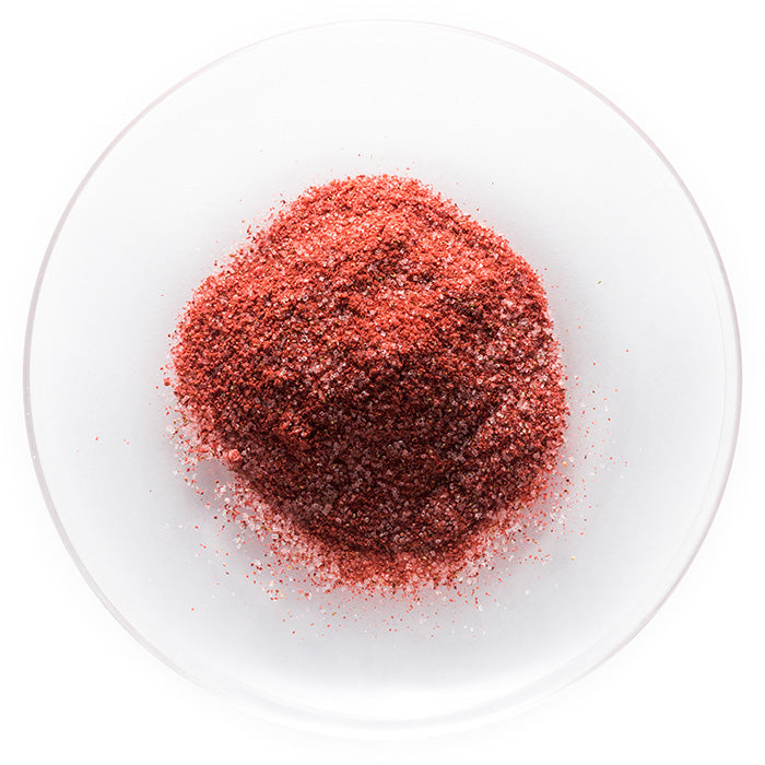 Ručno miješani šećer s mljevenim liofiliziranim jagodama ugodnog mirisa jagode. Prirodne je, crveno-ružičaste boje i izvrsnog okusa pravog voća. U usporedbi sa svježim jagodama, šećer nije kiseo, već sladak i ukusno voćni s nježnim okusom jagode. Mljevene jagode rehidrirati u tekućini i lagano zgusnuti jelo.