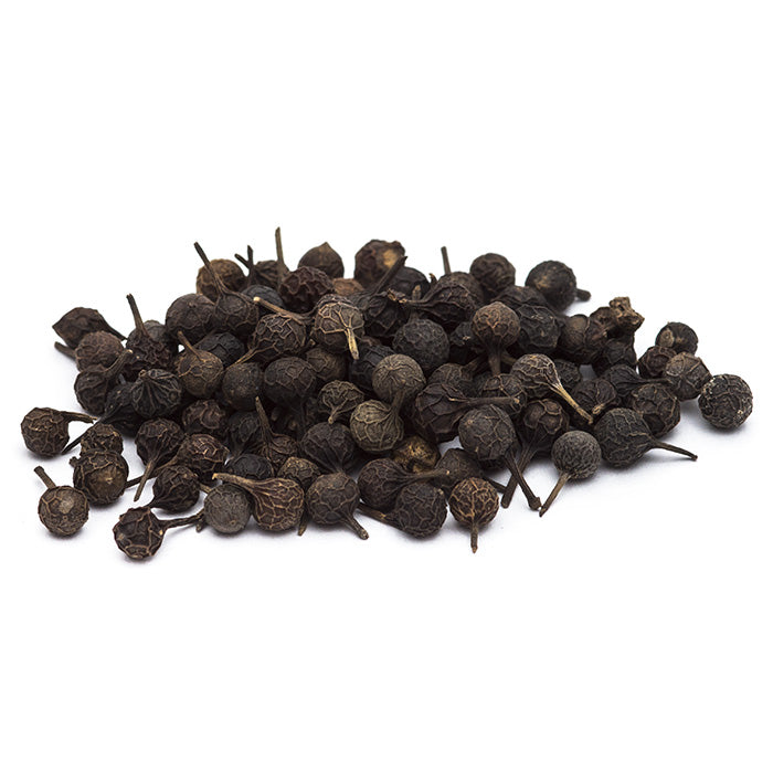 Tamno smeđi, sivi do crni okrugli osušeni plodovi paprike s naboranom kožicom i karakterističnom peteljkom. Ugodne su voćne arome sa svježim notama eukaliptusa i mente. Njihov pikantni okus izdaleka podsjeća na crni papar, ali više dominira svježina eukaliptusa, a istovremeno je i gorkast. Nije nimalo oštar, kuhanjem postaje mekši i slađi.