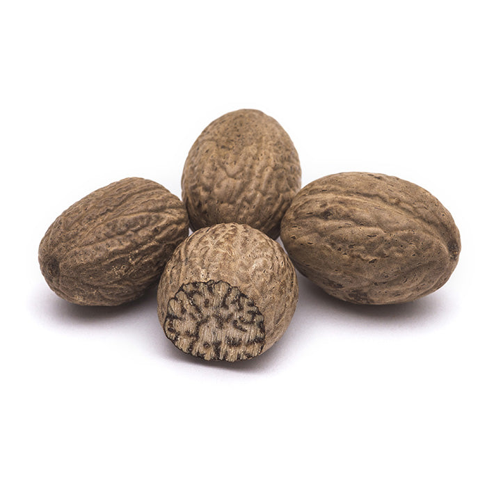 Velika, svijetlosmeđa, ovalna i blago naborana jezgra sjemenki ploda mirisnog muškatnog oraščića s mramoriranom unutrašnjosti oker-smeđe boje. Plijene svojom egzotičnom, slatkom i ugodno ljutom aromom s notama borovih iglica i izrazitim, bogatim, slatko gorkim okusom, nježno grijućim notama klinčića.