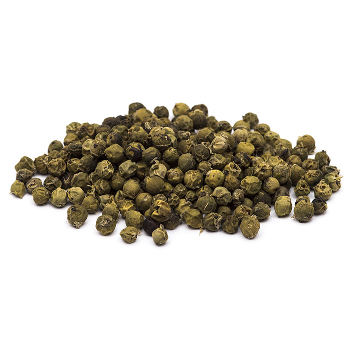 Zeleni osušeni nezreli plodovi crnog papra, lomljivi i ugodno hrskavi, tipične naborane površine. Ručno ubrani puno prije sazrijevanja i pažljivo osušeni kako bi zadržali lijepu zelenu boju. Raznovrsne, svježe i pikantne arome s notama agruma. Ugodno oštro i energično, svježeg okusa s karakteristikama svježeg zelenog voća.